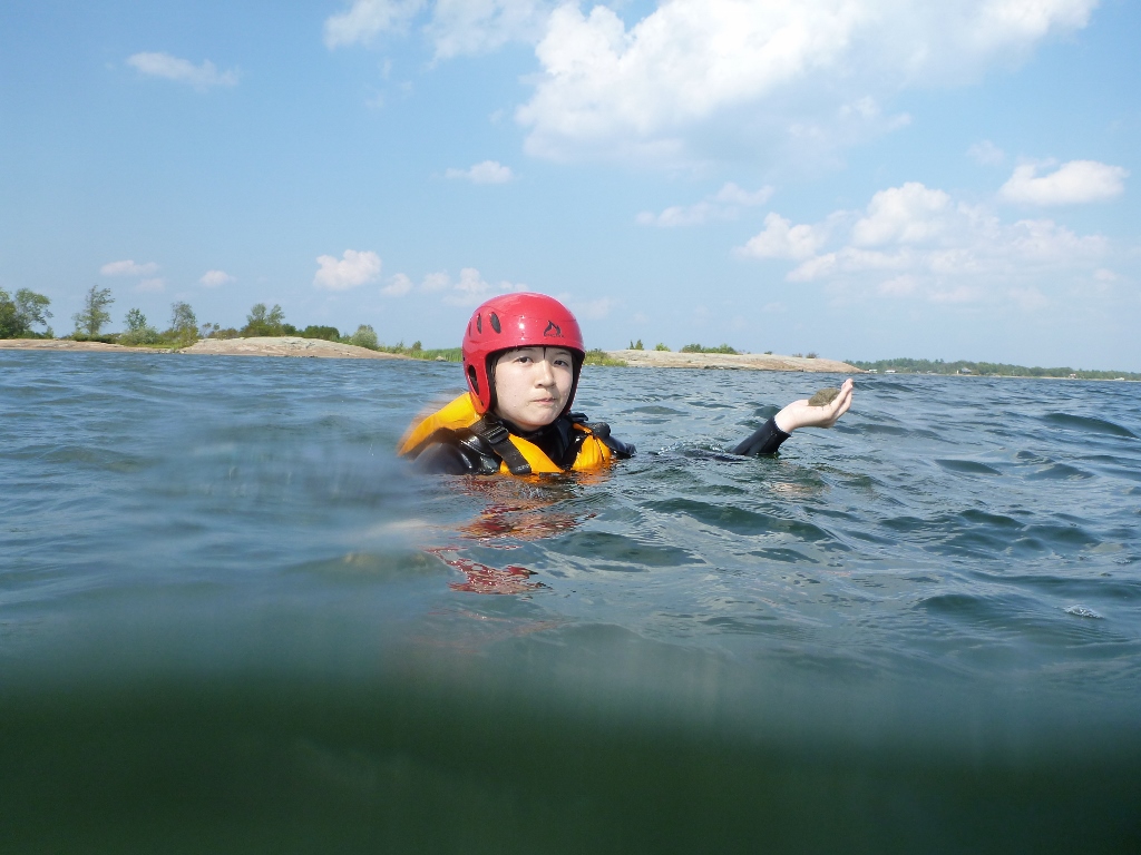 我们到了指定的地方,双手抱在胸前,不呼吸然后就跳了下去,湖水并不是十分的冷,我们两个人一组围着船游了两圈,然后四个人游了两圈。接着Billy让我们游到岸边捡一把沙子回来,游到过去我已经有一点累了。随后把沙子放在鞋子里带回去,可以回到去的时候,鞋子里的沙子已经还剩下一点了,我们在水里等队友回来,因为这是一个团队,要一齐上船,回到去我们已经没力气了,洗了澡在等饭吃。